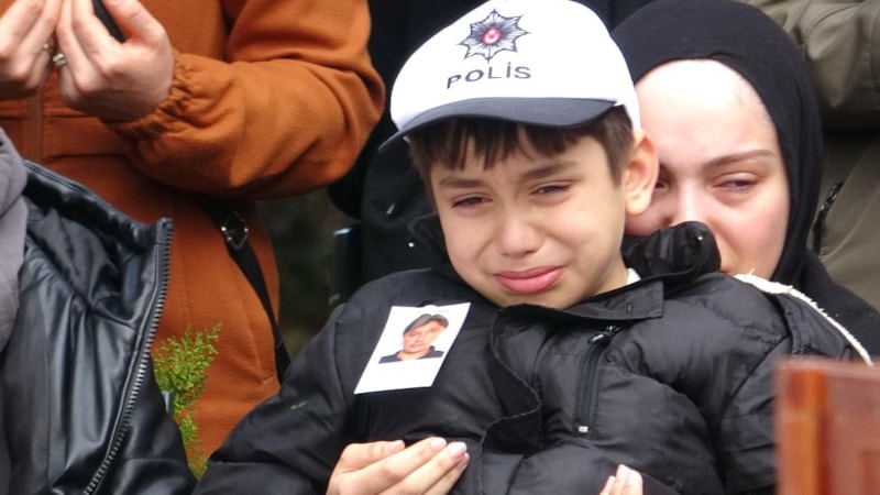 Tokat’ta kalp krizi sonucu hayatını kaybeden polis memuru Servet Yalçındağ için düzenlenen törene 7 yaşındaki Muhammed babasının polis şapkasını takarak katıldı.