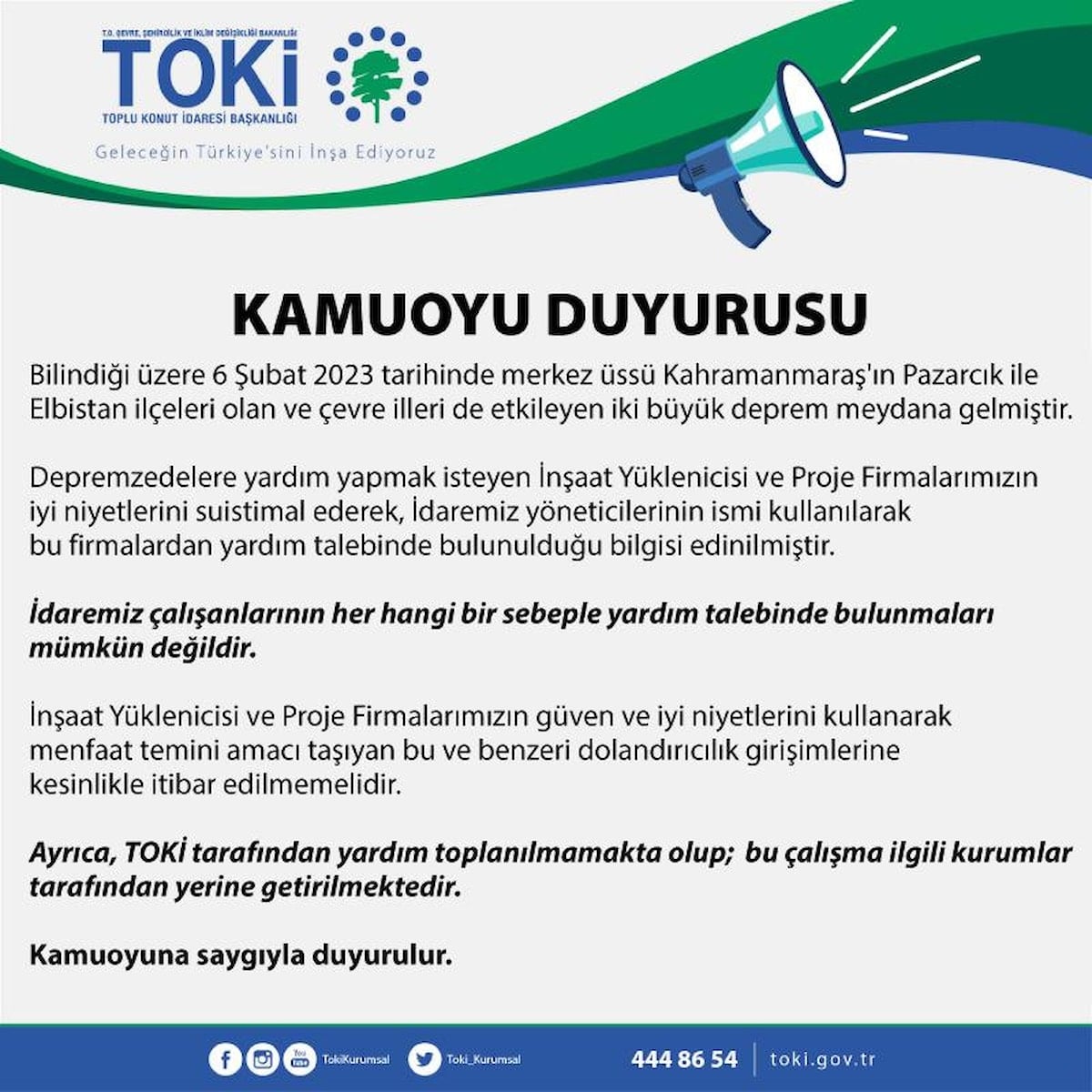 Depremzedelere yardım yapmak isteyen inşaat yüklenicisi ve proje firmalarının iyi niyetleri suistimal edilerek, TOKİ yöneticilerinin ismi kullanılarak yardım talebinde bulunulduğuna dikkat çekilen açıklamada şu ifadeler kaydedildi: