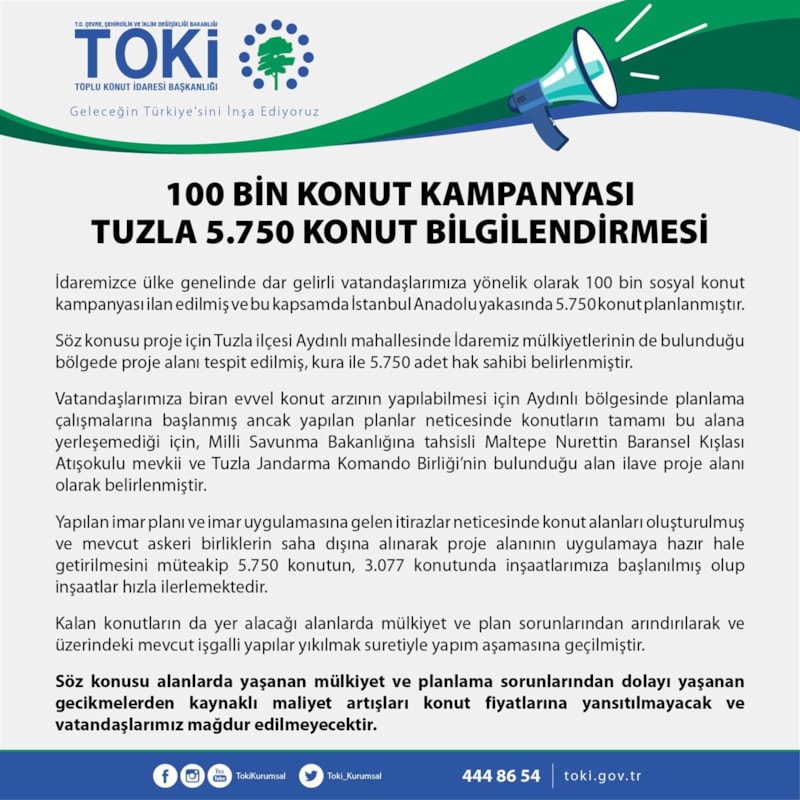 Toplu Konut İdaresi Başkanlığı (TOKİ), 100 bin konut kampanyası kapsamında İstanbul'un Tuzla ilçesinde yapılacak konutlara ilişkin açıklamada bulundu.