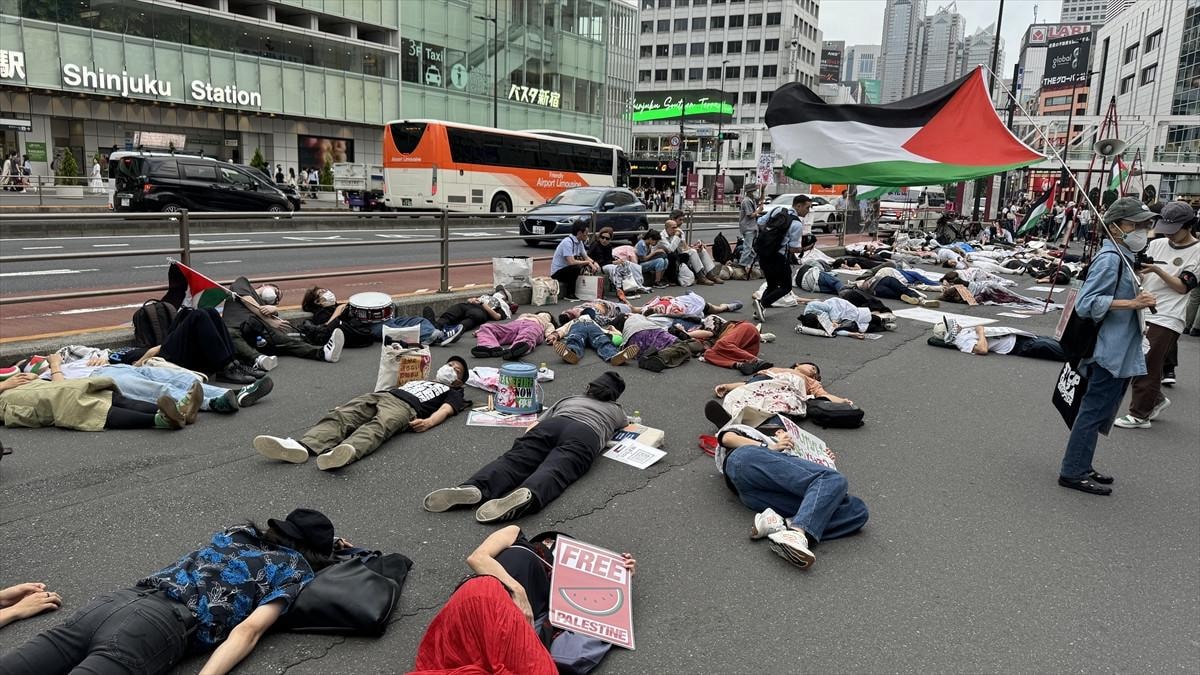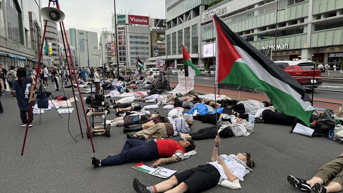 İsrail ordusunun Gazze Şeridi'ne saldırılarını protesto eden göstericiler, "İsrail'e yaptırım uygula" ve "Japonya halkı Filistin halkıyla beraber" yazılı pankartlar taşıdı.