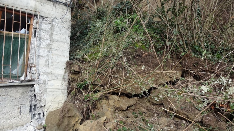 Yamaçtan koparak binanın 2. katına kadar çıkan toprak kütlesi, bir evin mutfak duvarına ve binanın kolonlarında zarar verdi.