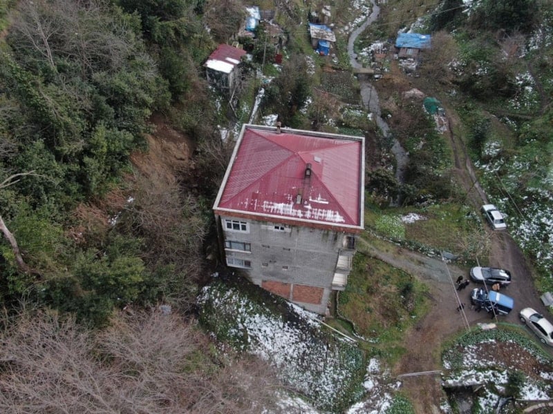 Trabzon’un Ortahisar ilçesinde 5 katlı binanın arka kısmında bulunan ve kar yağışı nedeniyle yumuşayan toprak kütlesi, binanın arasına döküldü.