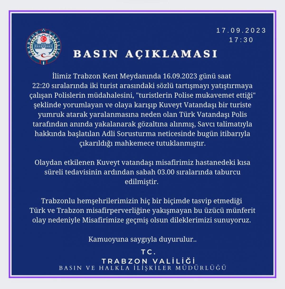 Açıklamada, Kuveytli turistin hastanedeki kısa süreli tedavisinin ardından sabaha karşı taburcu edildiği kaydedilerek, "Trabzonlu hemşehrilerimizin hiçbir biçimde tasvip etmediği, Türk ve Trabzon misafirperverliğine yakışmayan bu üzücü münferit olay nedeniyle misafirimize 'geçmiş olsun' dileklerimizi sunuyoruz." ifadesine yer verildi.