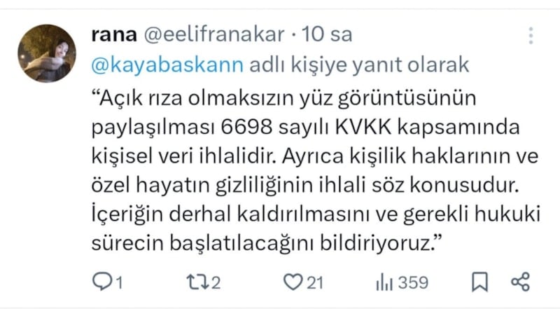 Genç kızın yakınları, "Siz bunu izinsiz paylaştınız. Biz de susmayacağız", "Açık rıza olmaksızın görüntüsünün paylaşılması 6698 sayılı KVKK kapsamında kişisel veri ihlalidir. Kişilik haklarının ve özel hayatın gizliliğinin ihlali söz konusudur. İçeriğin derhal kaldırılmasını ve gerekli hukuki sürecin başlatılacağını bildiriyoruz" diyerek tepkilerini dile getirdi.