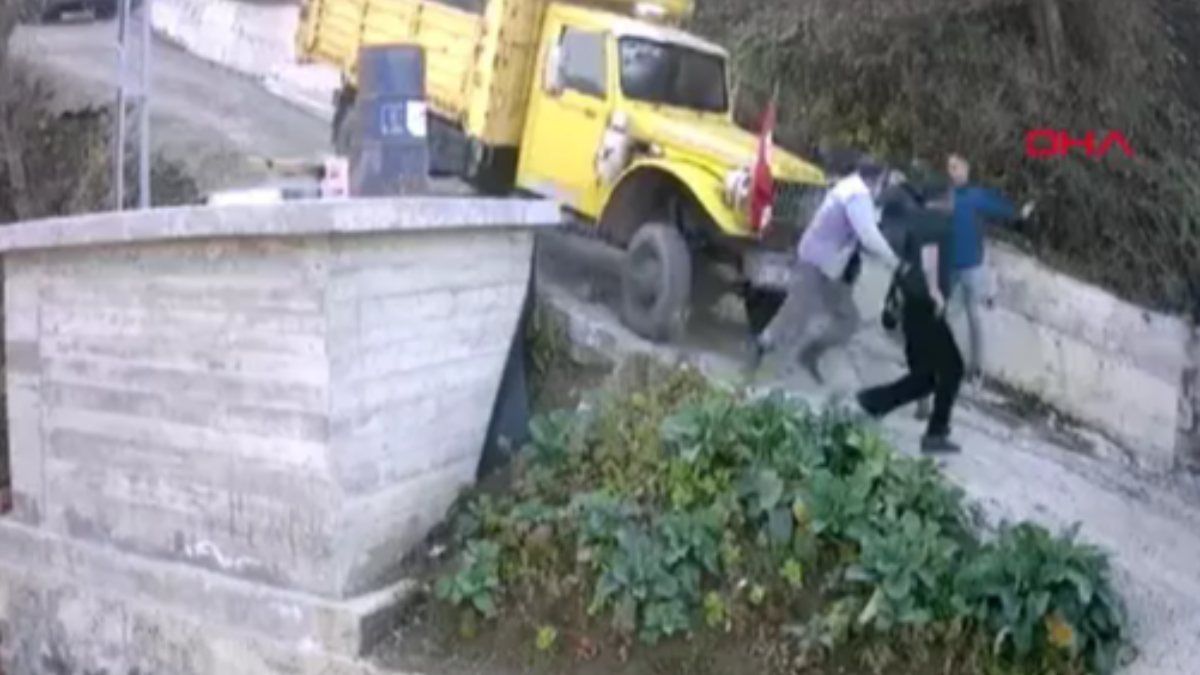Trabzon'da yolda kalan kamyonun altında kalmaktan saniyelerle kurtuldular