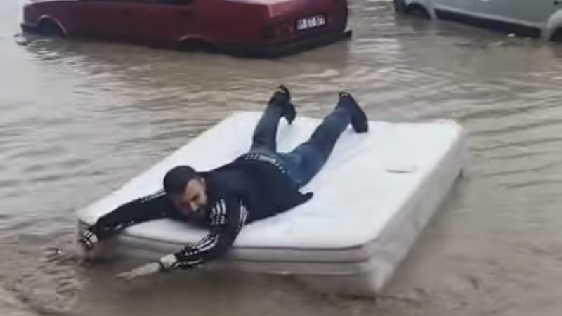 Ortahisar ilçesinde şiddetli yağış sonrası oluşan su birikintisinde bulduğu yatağı suya bırakan bir vatandaş, göle dönen caddede yatak üzerinde ilerledi.