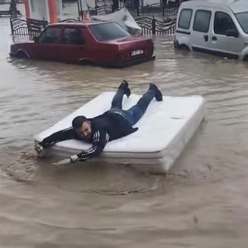 Elleriyle suyu kürek gibi çekerek ilerlemeye çalışan vatandaş, göle dönen caddede rahat tavırlarıyla adeta yatak sefası yaptı.