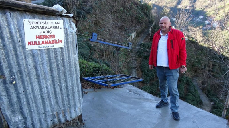 Sürmene ilçesinde yaşayan İlyas Dokgöz, yıllar önce yaptığı teleferiği akrabalarının ranta çevirmesi üzerine 'Şerefsiz olan akrabalarım hariç herkes kullanabilir' yazılı tabela asarak tartışmalara son verdi.