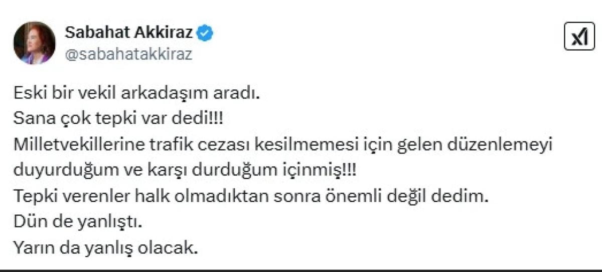 Akkiraz, "Eski bir vekil arkadaşım aradı. Sana çok tepki var dedi!!! Milletvekillerine trafik cezası kesilmemesi için gelen düzenlemeyi duyurduğum ve karşı durduğum içinmiş!!! Tepki verenler halk olmadıktan sonra önemli değil dedim. Dün de yanlıştı. Yarın da yanlış olacak." ifadelerini kullandı.