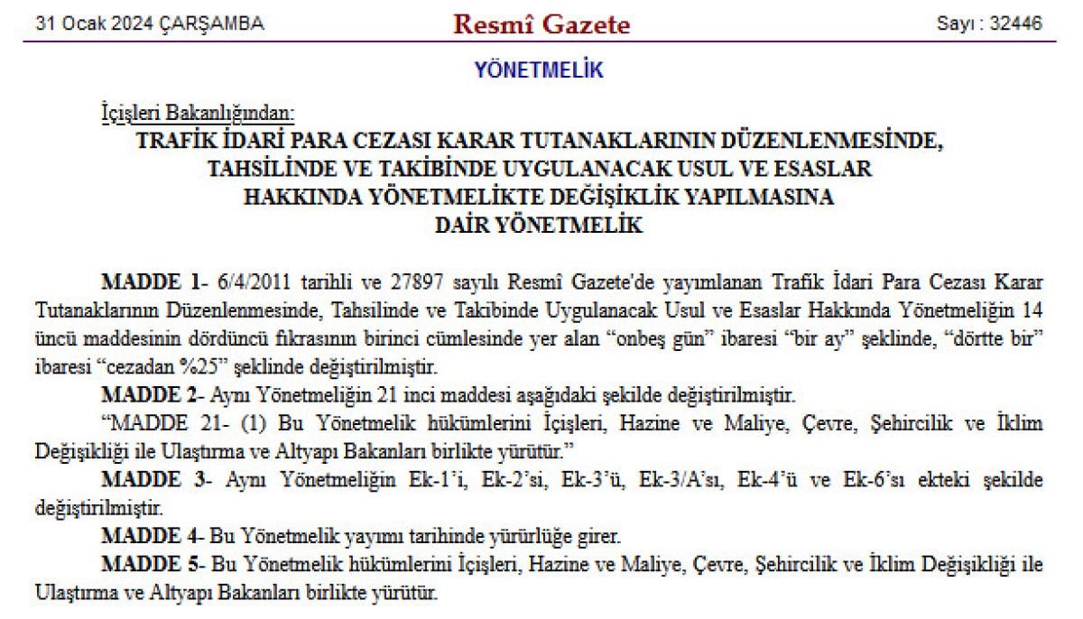 Resmi Gazete'de yayınlanan karara göre, trafik cezalarında indirimli ödeme süresi 15 günden 1 aya çıkarıldı.