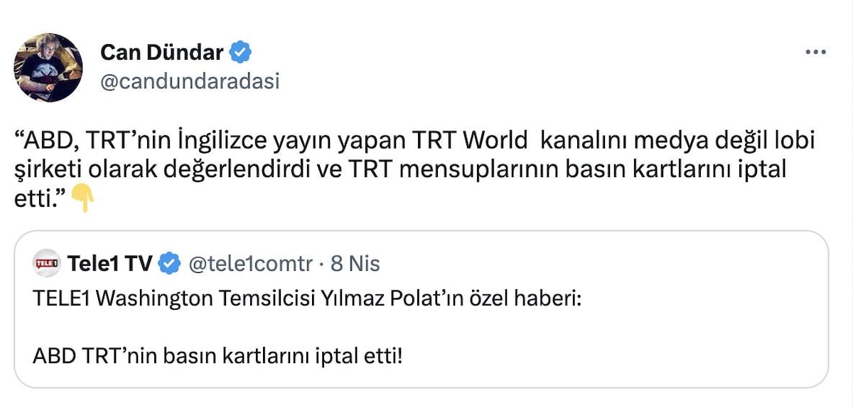 Bunun sosyal medyada paylaşılmasının ardından Dündar kısa sürede paylaşımı alıntılayarak, "ABD, TRT’nin İngilizce yayın yapan TRT World kanalını medya değil lobi şirketi olarak değerlendirdi ve TRT mensuplarının basın kartlarını iptal etti." ifadelerini kullandı.