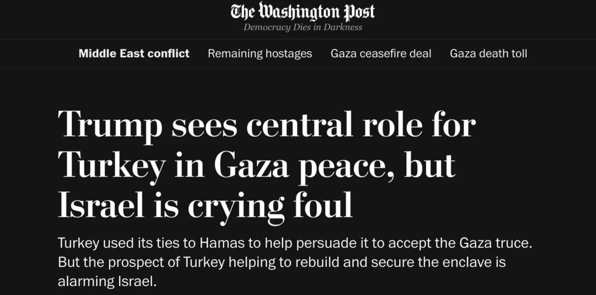 Washington Post gazetesinin, "Trump, Türkiye'nin Gazze barışında merkezi bir rol oynadığını düşünüyor ancak İsrail buna itiraz ediyor" başlıklı makalesinde Orta Doğu'daki sürece ilişkin gelişmeler mercek altına alındı.