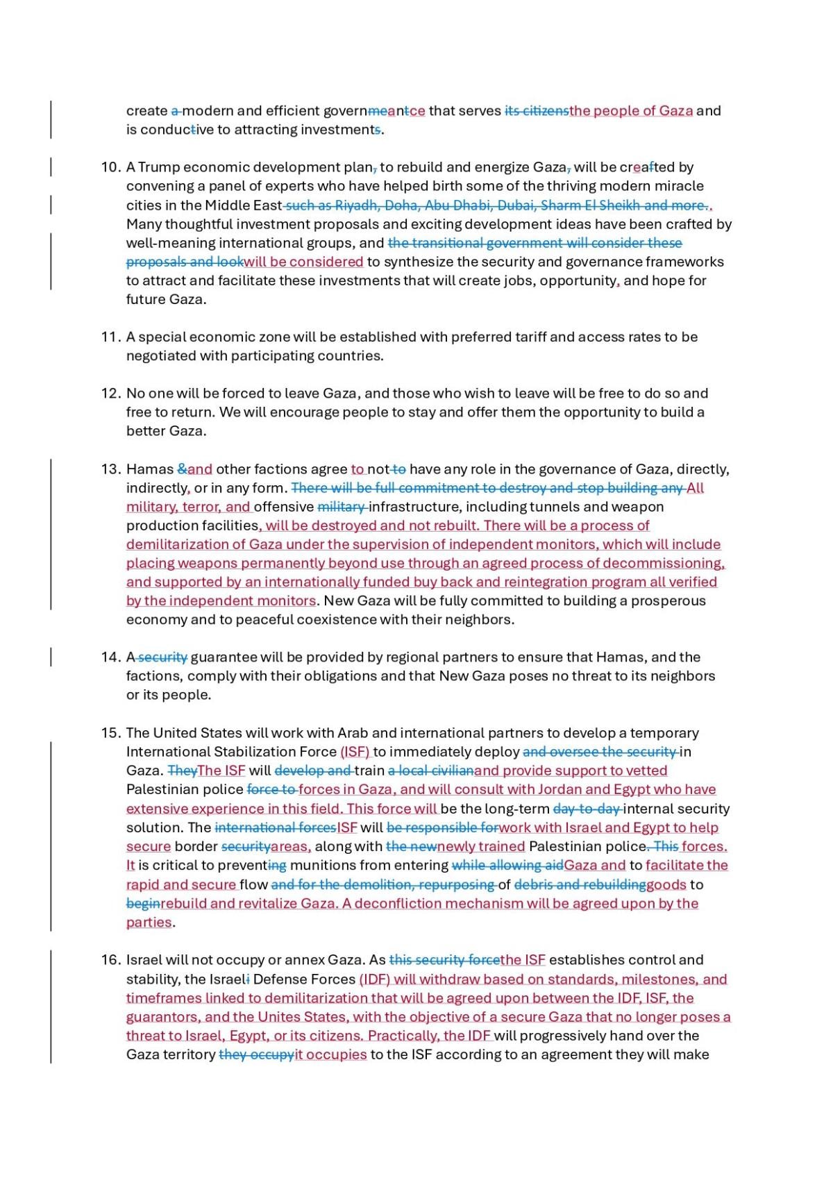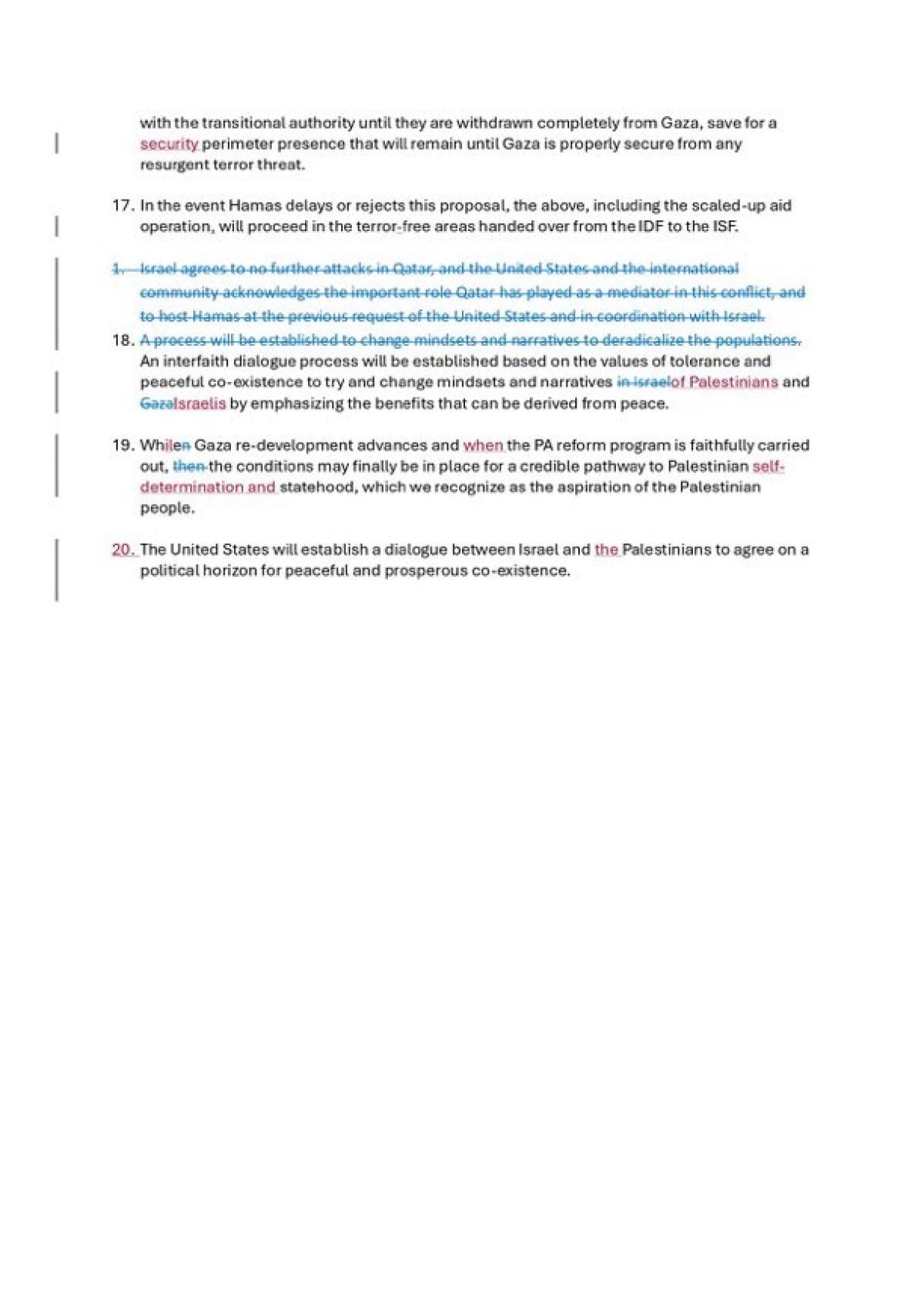 Diğer yandan Trump planının Netanyahu güncellemesinden önceki hali de ABD medyasına yansıdı. Metinde çıkartılan ifadelerin üzerinin çizildiği görülüyor.