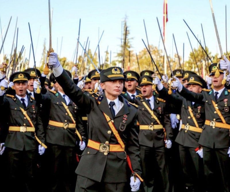 Milli Savunma Üniversitesi Kara Harp Okulu’nda, 30 Ağustos’ta düzenlenen diploma töreninde, resmi bölüm tamamlandıktan sonra yeni mezun teğmenlerin bir bölümü kılıç çekerek yemin etti.