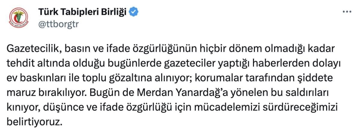 Gazetecilik, basın ve ifade özgürlüğünün hiçbir dönem olmadığı kadar tehdit altında olduğu bugünlerde gazeteciler yaptığı haberlerden dolayı ev baskınları ile toplu gözaltına alınıyor; korumalar tarafından şiddete maruz bırakılıyor. Bugün de Merdan Yanardağ’a yönelen bu saldırıları kınıyor, düşünce ve ifade özgürlüğü için mücadelemizi sürdüreceğimizi belirtiyoruz.