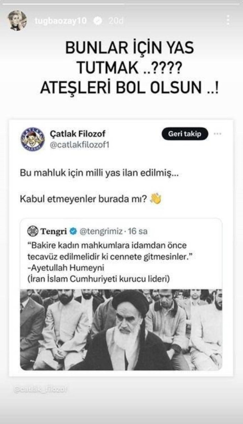 Bu karara karşı tepkisini sosyal medyada dile getiren Özay, İran'ın kurucu lideri Humeyni'nin resmini paylaştı ve "Bunlar için yas tutmak? Ateşleri bol olsun!" dedi. Özay'ın bu paylaşımı sosyal medyada geniş yankı buldu.