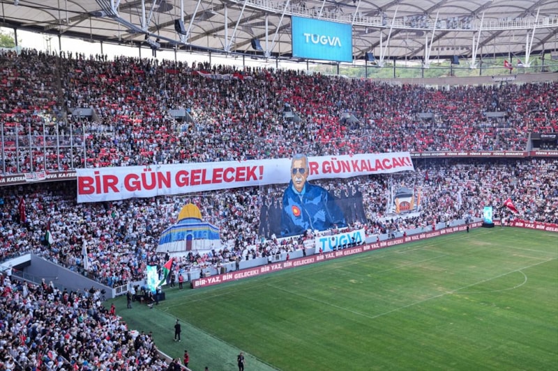 Programda gençlerin tekbir çekmesinden rahatsız olan gazete, "Stadyumdaki TÜGVA şovunda çocuklara tekbir getirttiler!" başlığını attı.