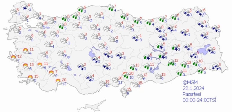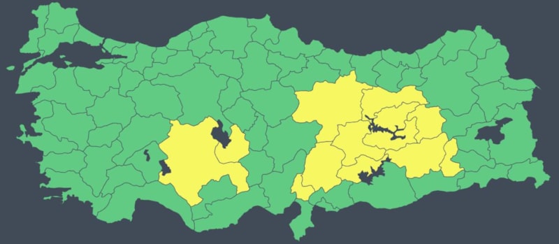 Sarı uyarı verilen iller Adıyaman, Aksaray, Batman, Bingöl, Diyarbakır, Elazığ, Erzincan, Konya, Malatya, Kahramanmaraş, Sivas, Osmaniye ve Tunceli olarak sıralandı.