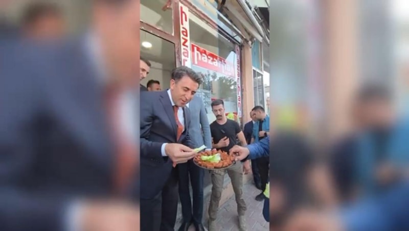 Tunceli Valisi Şefik Aygöl, esnaf ziyareti sırasında, ikramda bulunurken koruma polisine sadece marul uzattı. İçine çiğ köfte koymayı unutarak uzattığı marula bakan koruma polisinin o anları, görenleri gülümsetti.