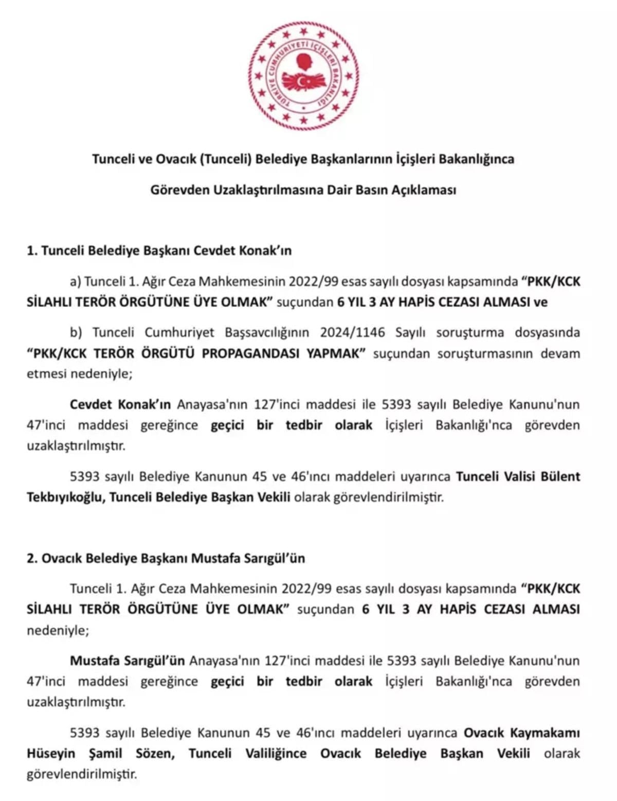 İçişleri Bakanlığı'ndan yapılan açıklamaya göre Tunceli Belediye Başkanı Cevdet Konak ve Ovacık Belediye Başkanı Mustafa Sarıgül görevden uzaklaştırıldı.