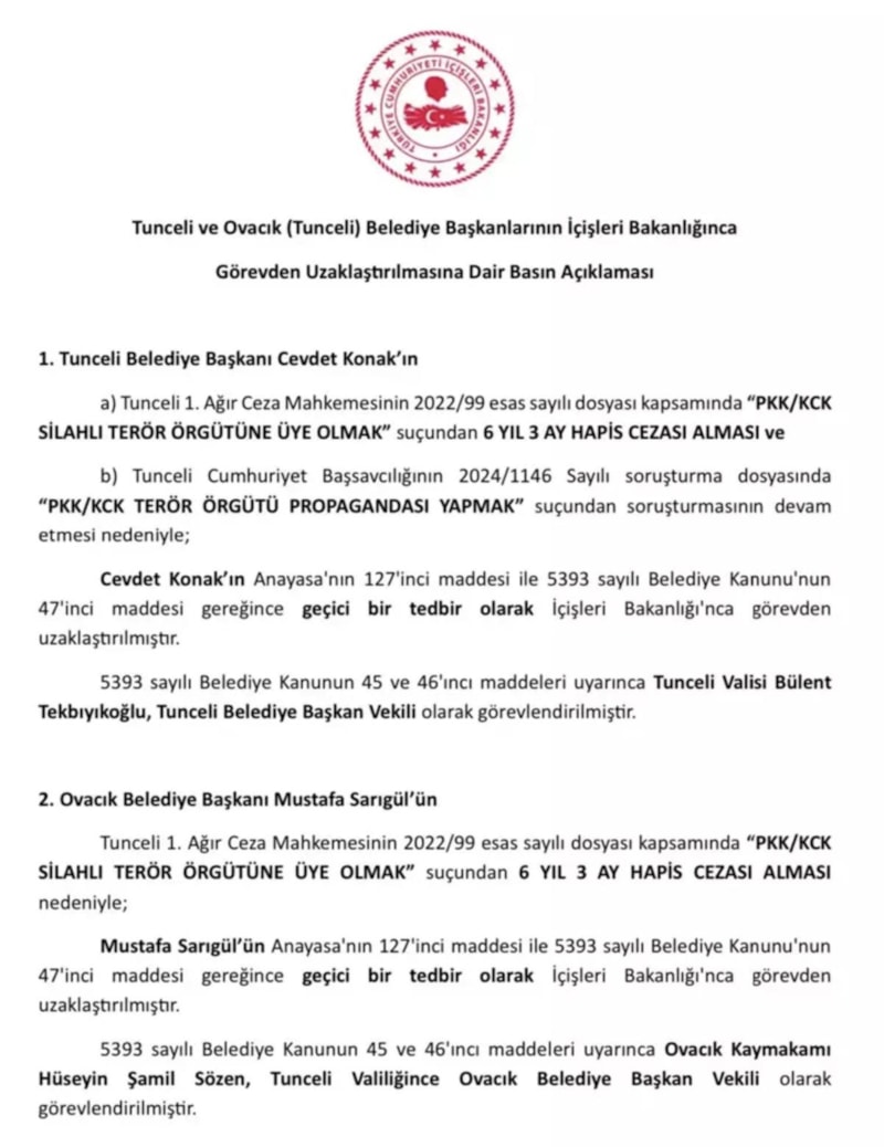 İçişleri Bakanlığı, Tunceli Belediye Başkanı Cevdet Konak ve Ovacık Belediye Başkanı Mustafa Sarıgül'ün görevden uzaklaştırıldığını açıkladı.