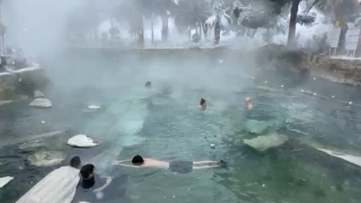 Beyaz cenneti ziyaret eden yabancı turistler, eksi 6 dereye kadar düşen hava sıcaklığı ve kar yağışına rağmen milattan önce 2. yüzyıldan kalan Hierapolis kentindeki antik Kleopatra Havuzu'na girmeyi ihmal etmedi. Turistler, 36 derece su sıcaklığına sahip olan ve içinde tarihi eseri barındıran antik havuzda yüzmenin keyfini çıkardı.