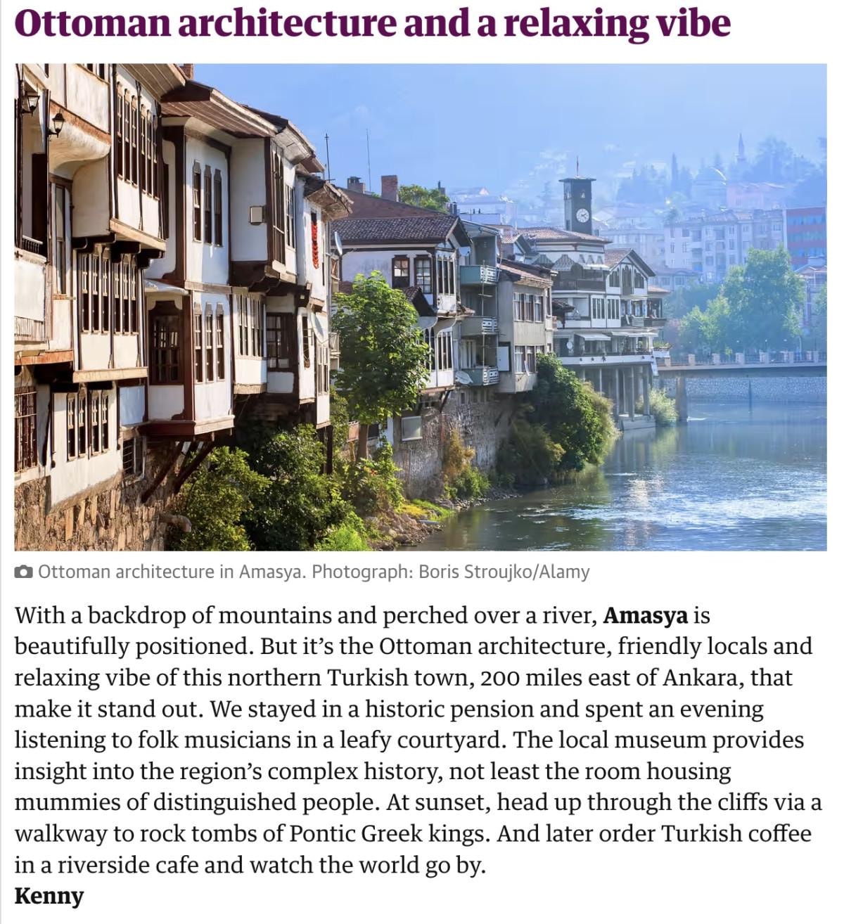 Türkiye’nin tarihi ve kültürel zenginlikleri de The Guardian'da geniş yer buldu. Amasya’nın tarihi Osmanlı evleri ve kaya mezarları, turistlerin en çok beğendiği duraklardan biri oldu.