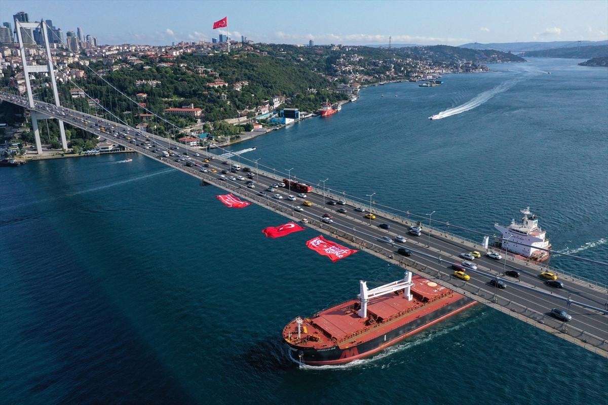 Turunç'un açıklamasının ardından 15 Temmuz Şehitler Köprüsü'nün ortasına kadar yürüyen gruptakiler 10 metre uzunluğunda 15 metre genişliğindeki Türk bayrağını birlikte asarak sarkıttı.