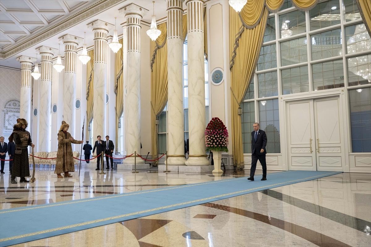 Cumhurbaşkanı Recep Tayyip Erdoğan, Akorda Cumhurbaşkanlığı Sarayı'na gelişinde Tokayev tarafından karşılandı.