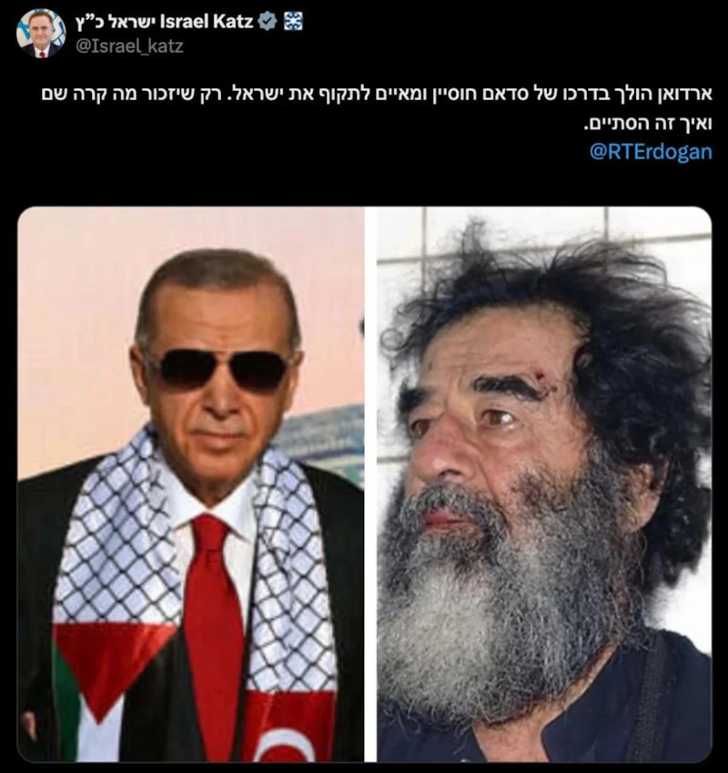 Irak'ın ABD tarafından devrilen ve idam edilen lideri Saddam Hüseyin ile Cumhurbaşkanı Erdoğan'ı bir tutan Katz, "Erdoğan İsrail'e saldırmayı planlıyormuş. Saddam da böyle diyordu. Birisi ona Saddam'ın sonunu hatırlatsın." şeklinde skandal ifadeler kullandı.