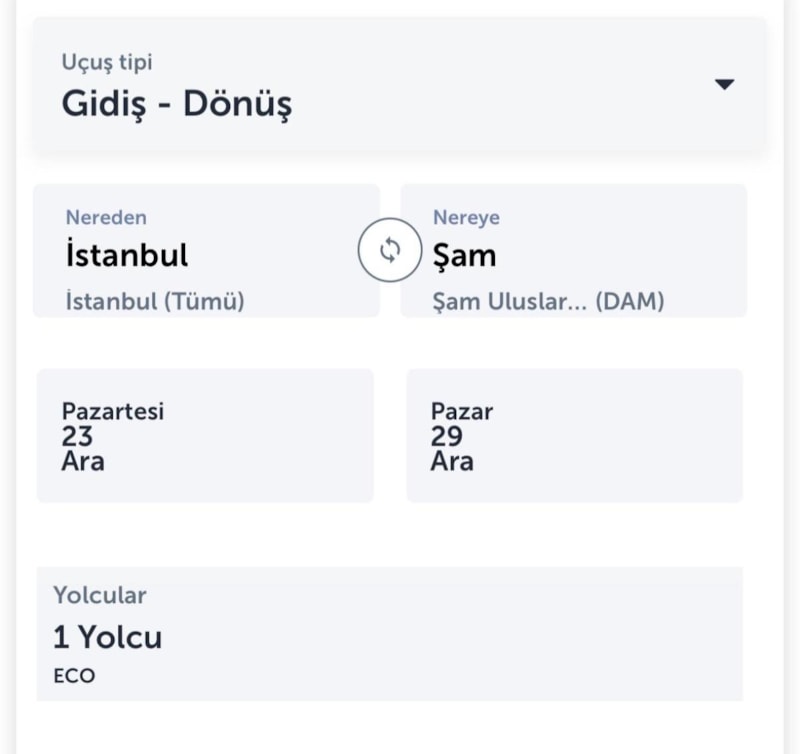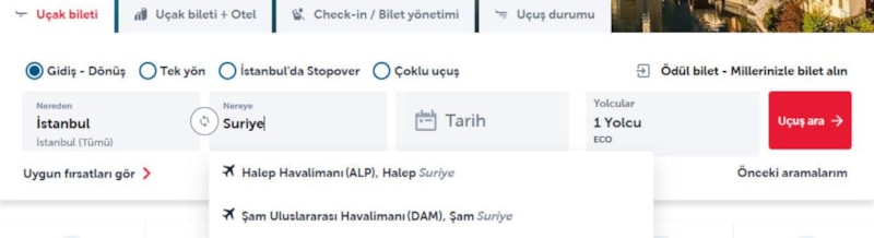 THY'nin internet sitesi ve mobil uygulamalarında uçuş planlama kısmında Şam ve Halep Havalimanı seçeneği gözüktü..