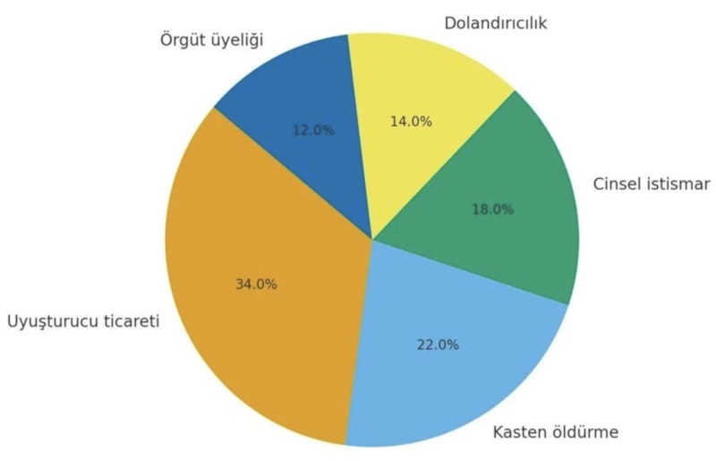 En fazla işlenen suçlar ise sırasıyla; kasten öldürme ve öldürmeye teşebbüs, cinsel istismar ve çocuk istismarı, dolandırıcılık ve bilişim suçları ile organize suç örgütü üyeliği ve liderliği oldu.