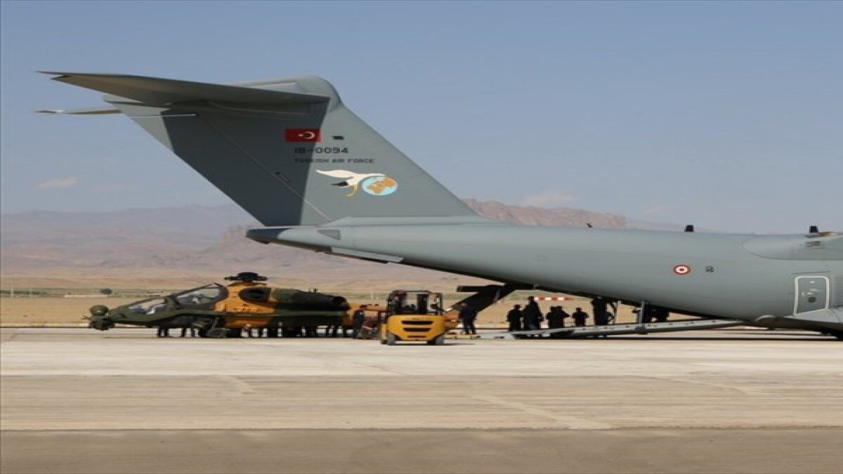 Türk Silahlı Kuvvetlerinin askeri uçağıyla getirilen savaş helikopterleri törenin ardından teknik ekipler tarafından tatbikat için hazır hale getirildi.