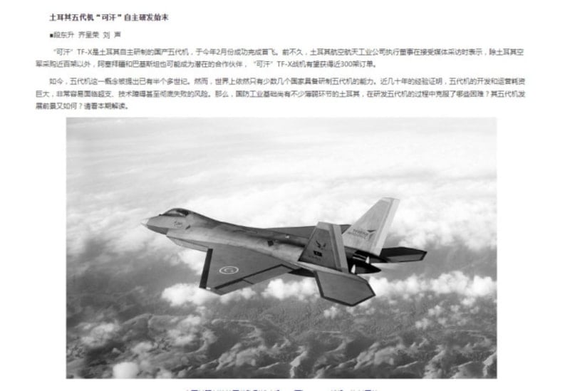 Çin ordu gazetesi, Türkiye’nin 5'inci nesil savaş uçağı projesini derinlemesine ele aldığı bir makale yayınladı. Makalede, F-35 projesinden çıkarılmasının Türkiye’yi kendi savaş uçağını geliştirmede daha azimli hale getirdiği belirtildi.
