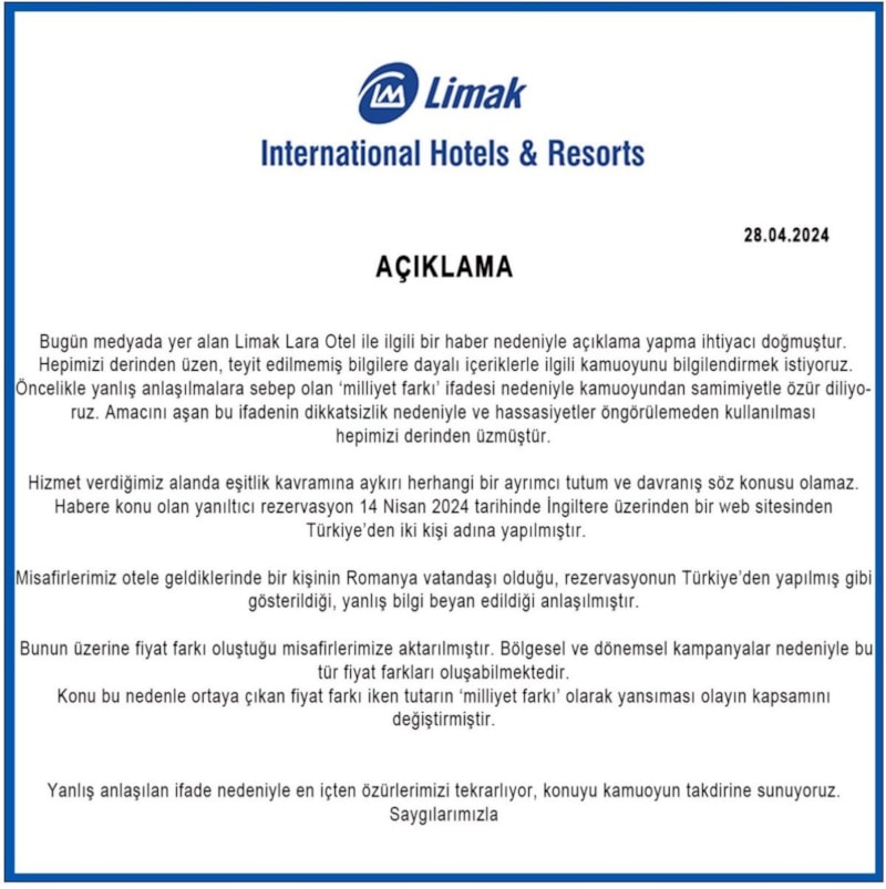 Yaşanan bu gelişmelerin ardından Limak, resmi sitesinden bir açıklama yayınladı. Şirket açıklamasında ‘milliyet farkı’ ifadesi nedeniyle özür dilendi.