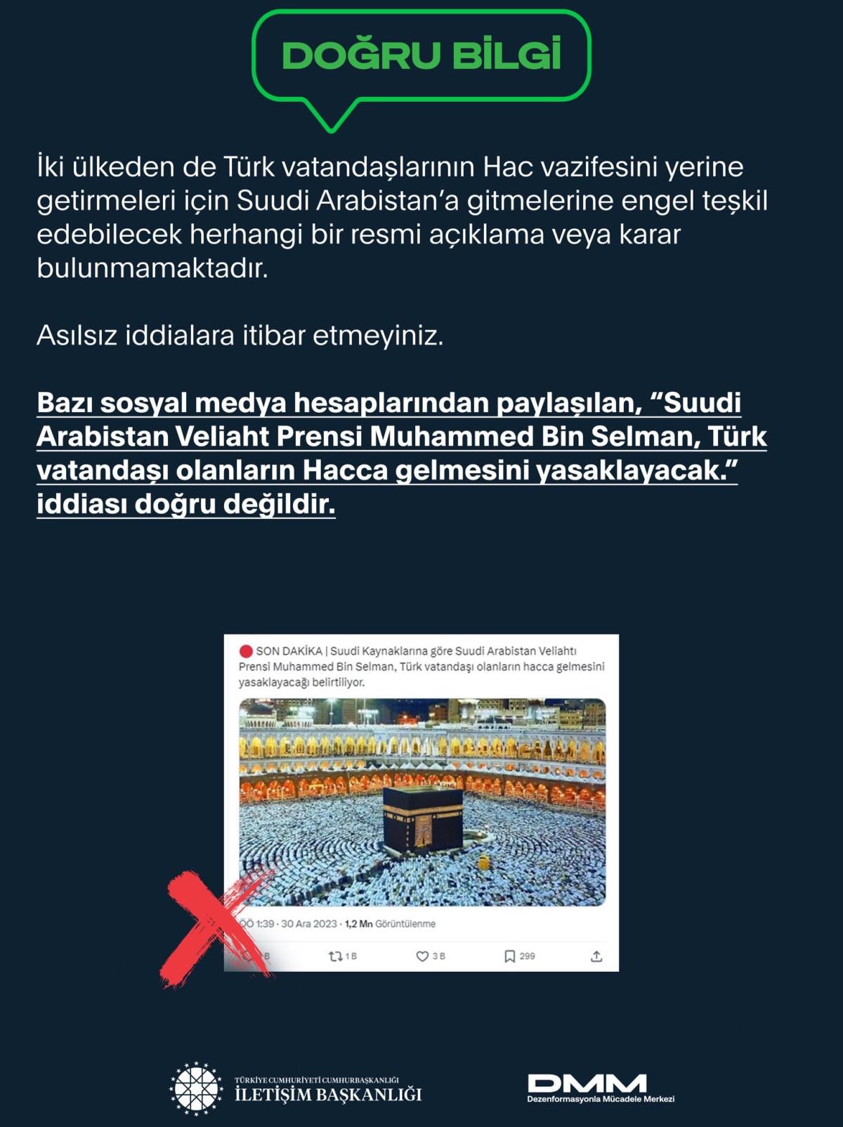 "Bazı sosyal medya hesaplarından paylaşılan, 'Suudi Arabistan Veliaht Prensi Muhammed bin Selman, Türk vatandaşı olanların hacca gelmesini yasaklayacak' iddiası doğru değildir. İki ülkeden de Türk vatandaşlarının hac vazifesini yerine getirmeleri için Suudi Arabistan'a gitmelerine engel teşkil edebilecek herhangi bir resmi açıklama veya karar bulunmamaktadır. Asılsız iddialara itibar etmeyiniz."