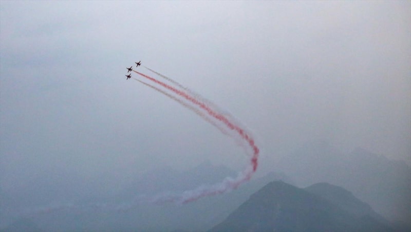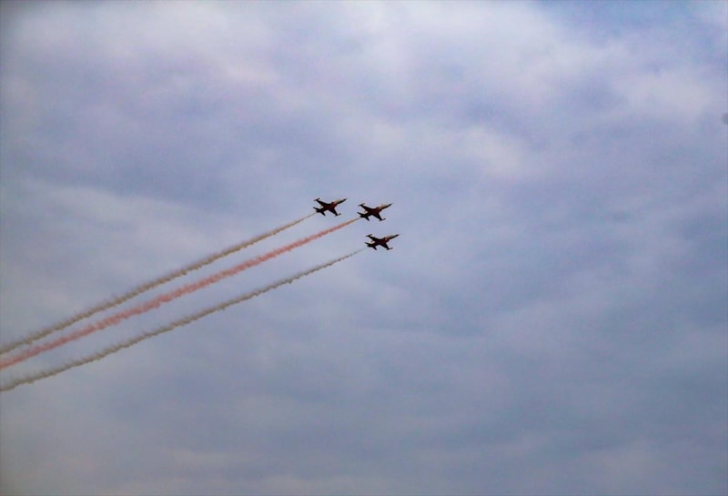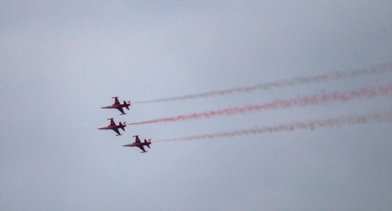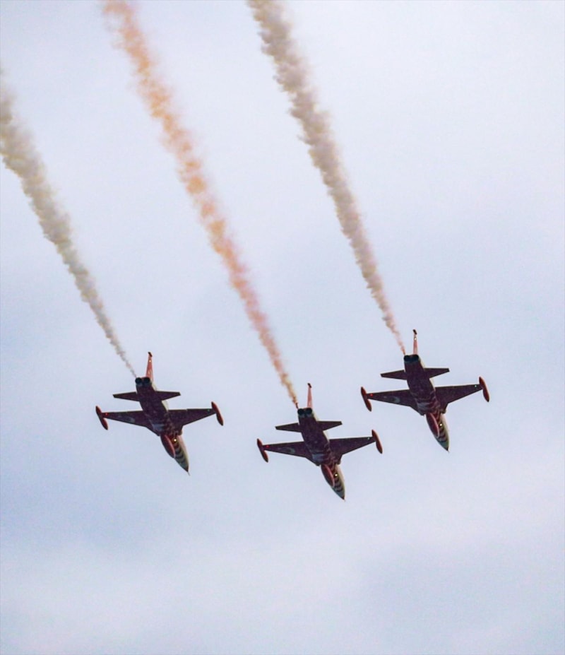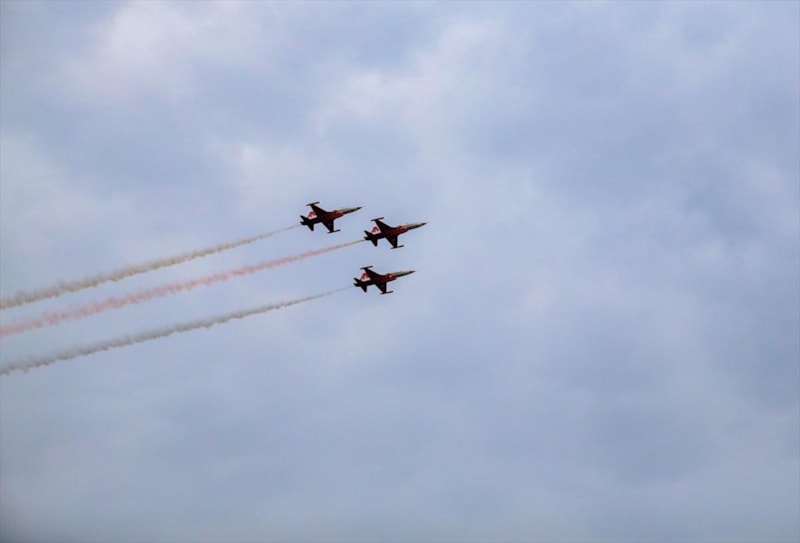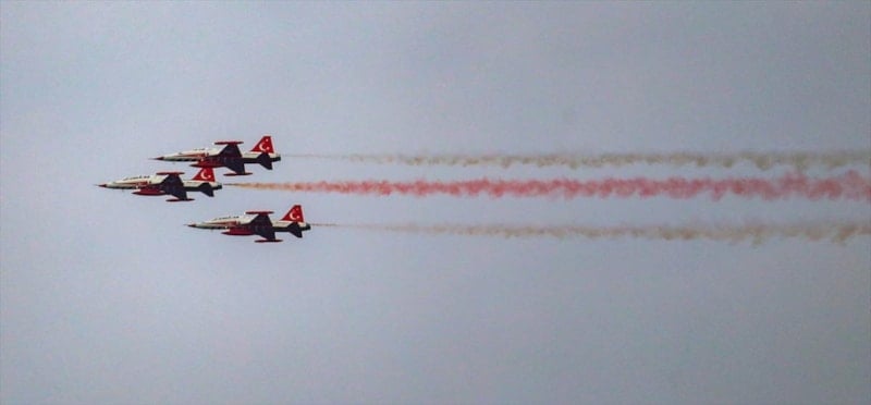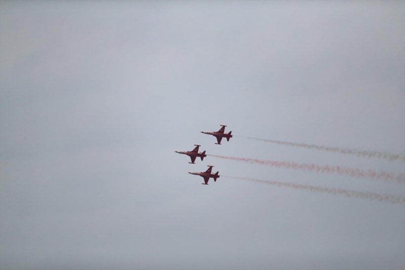 Pilotlar gösteri sonunda varyantlarda bulunan ve bugün yarıya kadar indirilmiş olan dev Türk bayrağına yakın uçuş yaparak Gazi Mustafa Kemal Atatürk'e saygı uçuşunu tamamladı.