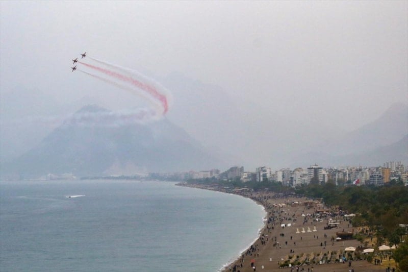 Yağmurlu havaya rağmen yüzlerce kişi Konyaaltı Sahili'nde şemsiyeleriyle gösteriyi izledi. Denizin üzerinde alçak uçuş yapan pilotlar, uzun süre alkışlandı.