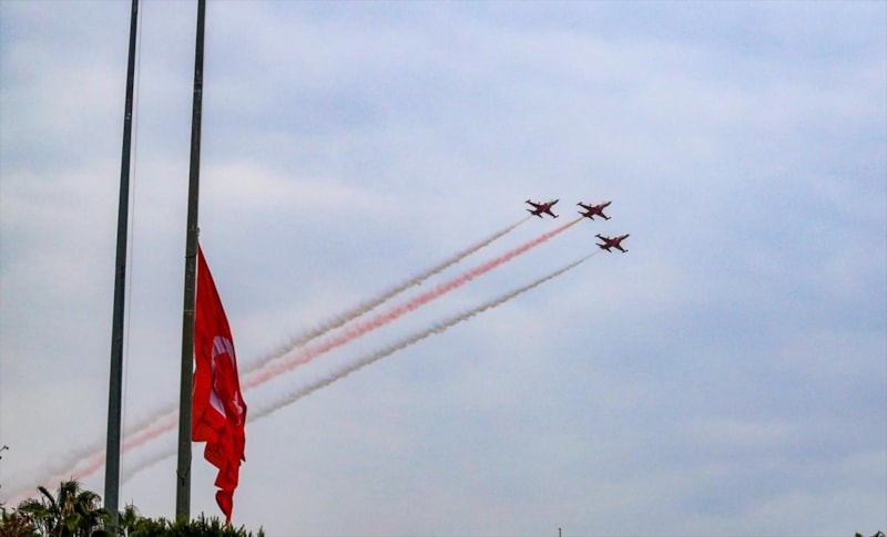 Türk Hava Kuvvetleri'nin akrobasi timi Türk Yıldızları, Gazi Mustafa Kemal Atatürk'ün ebediyete intikalinin 86. yıl dönümünde, Antalya Kültür Yolu Festivali kapsamında "Ata'ya Saygı" temalı bir uçuş gerçekleştirdi.