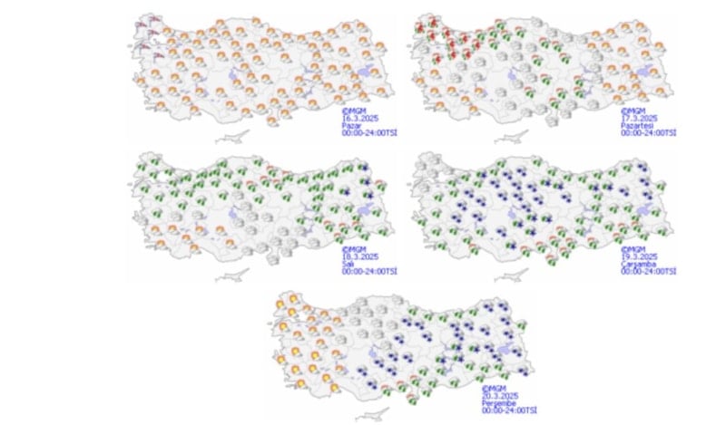 Soğuk ve yağışlı havanın, 24 Mart 2025 Pazartesi gününe kadar etkili olması beklenirken en düşük hava sıcaklığının 2 dereceye kadar düşeceğinin tahmin edildiği duyuruldu.