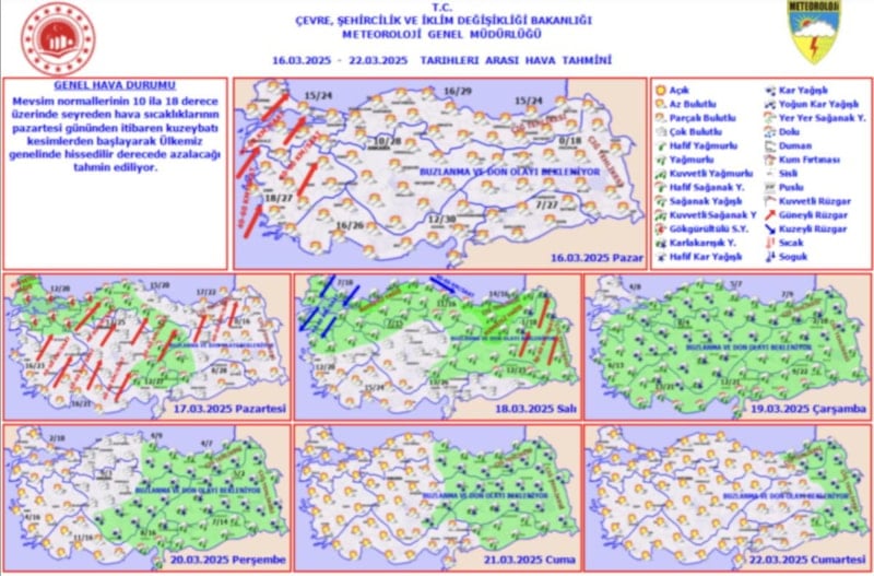 Martın son haftası ve Ramazan Bayramı haftası boyunca sıcaklıkların tekrar mevsim normallerine yükselmesinin öngörüldüğü belirtilen açıklamada, özellikle hafta sonunda beklenen lodos fırtınasına ve ardından gelecek soğuk hava dalgasına karşı dikkatli olunması uyarısında bulunuldu.