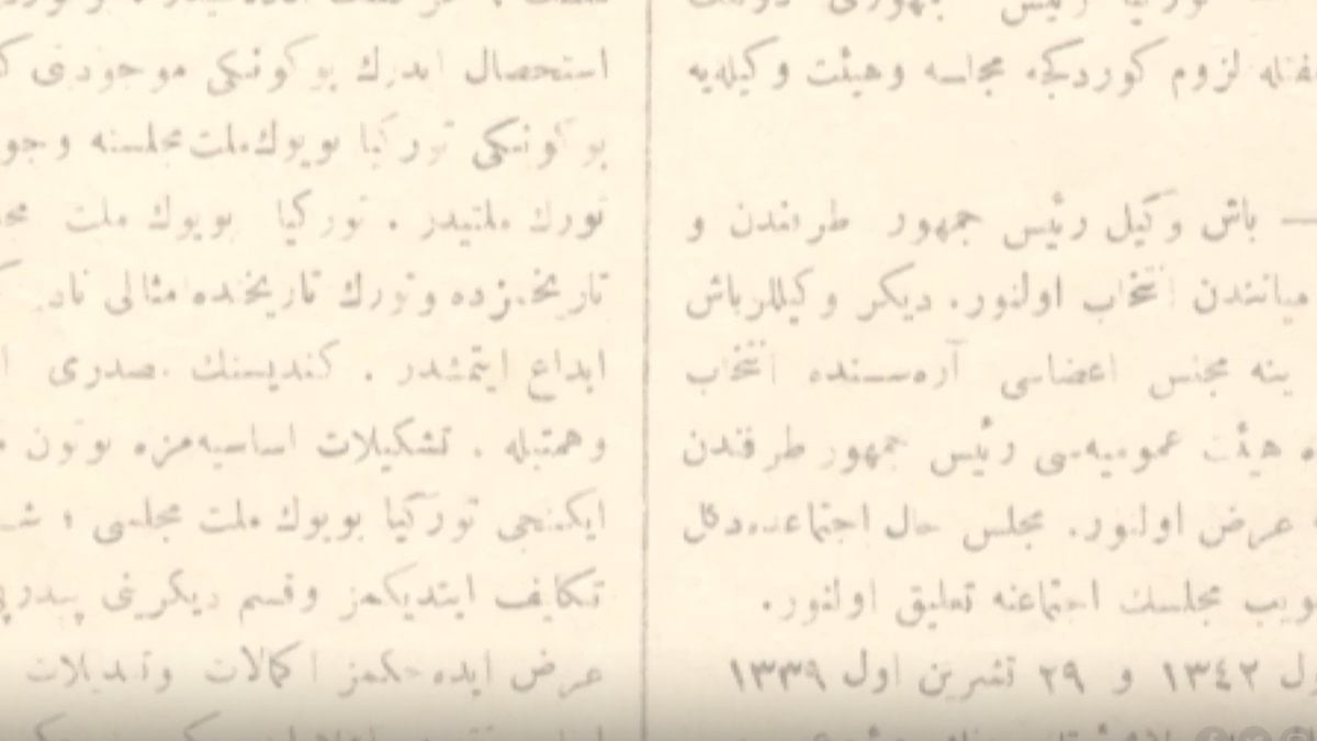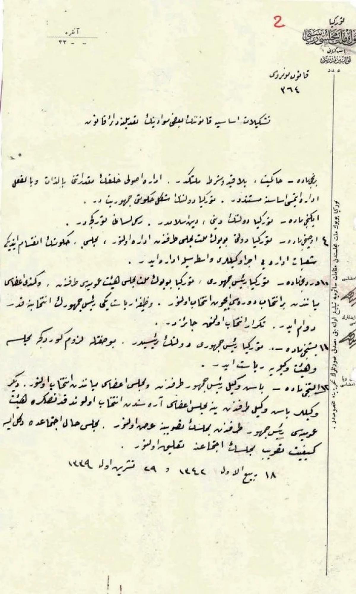 Bu sayfada Meclis’in Anayasa’da 29 Ekim 1923’te yaptığı değişikliklerin yer aldığı ve Meclis kâtiplerinin yazdıkları metnin orijinali, yani Cumhuriyet’in ilânının ilk resmî belgesi yer alıyor.
