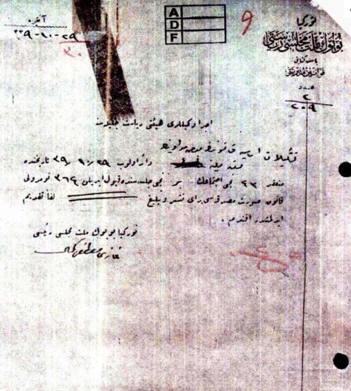 Mustafa Kemal Paşa’nın, Cumhuriyet’in ilânı ile ilgili kanunun Resmî Gazete’de yayınlanması için hükümete gönderdiği yazı (TBMM Atatürk Arşivi, Kutu no: 1/760, Fihrist no: 01027757-8).
