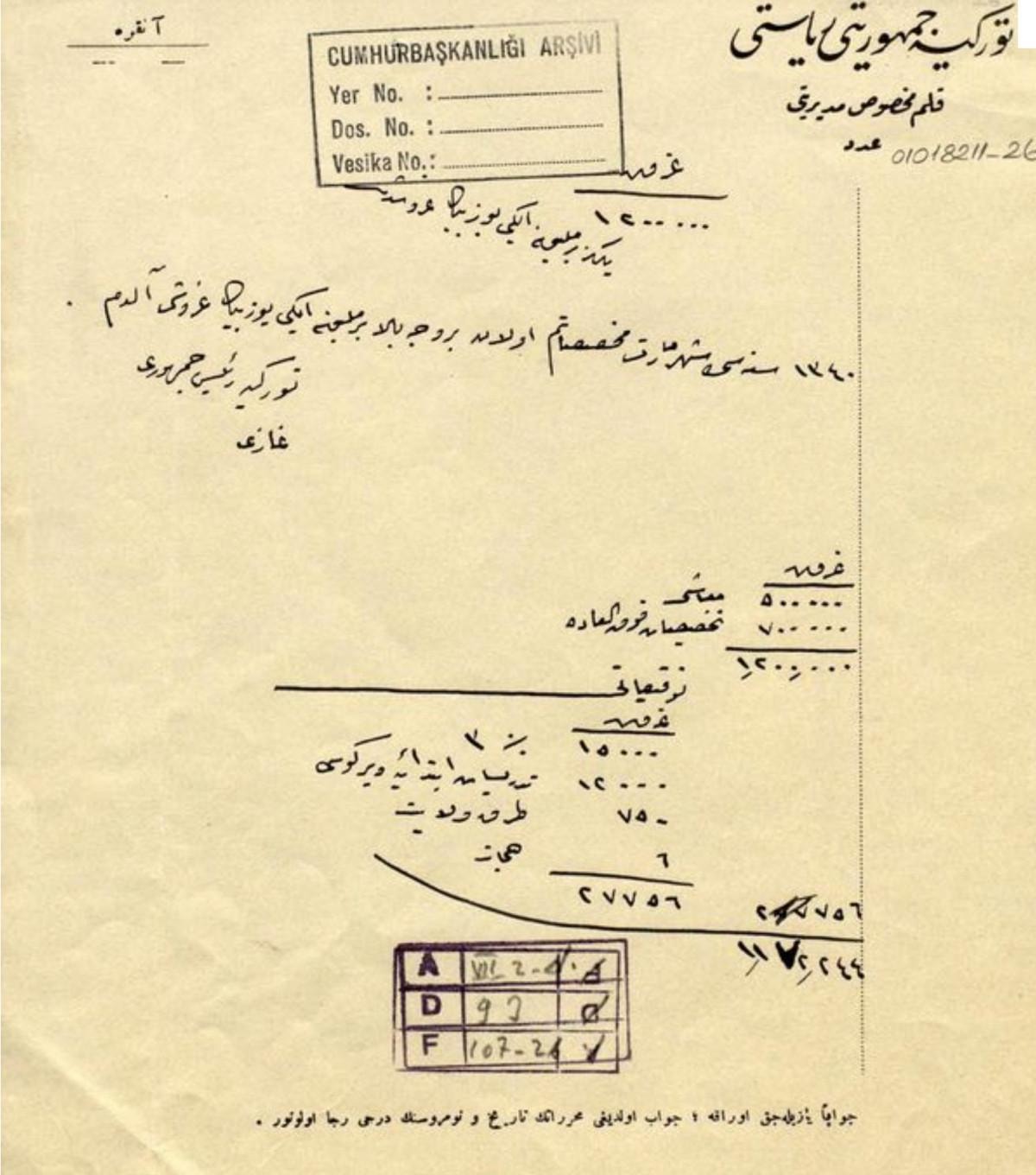 Mustafa Kemal Paşa’nın Türkiye’nin Cumhuriyet olmasının ardından 1924 Mart’ında hazırlanan ilk Cumhuriyet bütçesi ile belirlenen aylığını aldığına dair makbuz. Atatürk 500 bin kuruşu maaş, 700 bin kuruşu da “fevkalâde tahsisat” olarak 1 milyon 200 bin kuruş alıyor ve kesintilerden sonra eline 1 milyon 172 bin 244 kuruş, yani 11 bin 722 lira 44 kuruş geçiyor (Cumhurbaşkanlığı Arşivi, 01018211-26).