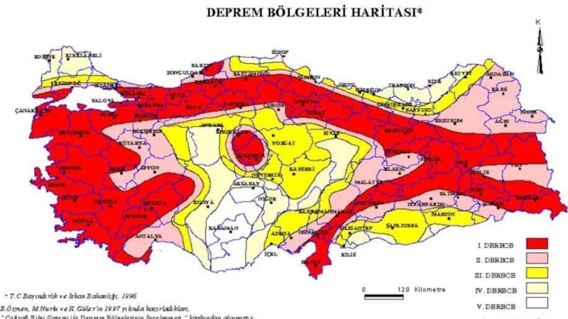 Türkiye'de Kuzey Anadolu Fay Hattı ve Doğu Anadolu Hattı ve Batı Anadolu fay hattı olmak üzere toplamda 3 büyük fay hattı bulunuyor. Deprem haritasında kırmızı renkte görülen iller birinci derece deprem bölgesi, pembe renkte olanlar ikinci derece riskli bölge, sarı olan iller üçüncü dereceden deprem bölgesi olarak geçiyor.
