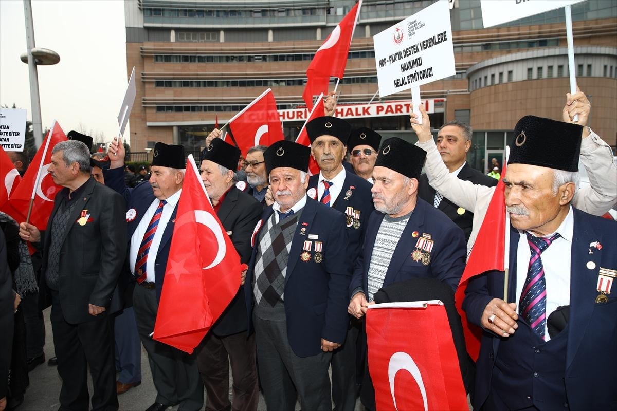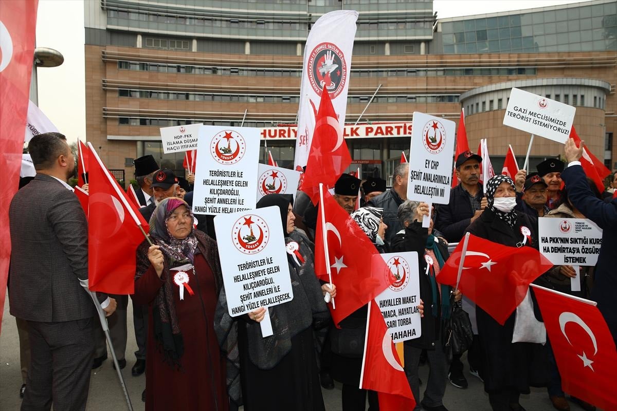 CHP Genel Merkezi önünde toplanan Türkiye Gaziler ve Şehit Aileleri Vakfı üyeleri, HDP ile yapılan görüşmeden dolayı CHP'yi protesto etti.