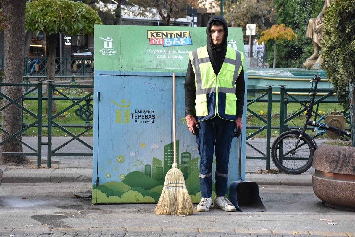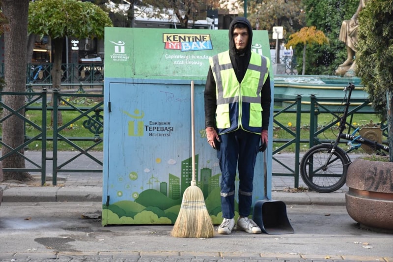 Eskişehir'de saat 09.05'te sirenlerin çalmasıyla İsmet İnönü-1 Caddesi'nde görevli temizlik görevlileri ile vatandaşlar, saygı duruşunda bulundu.