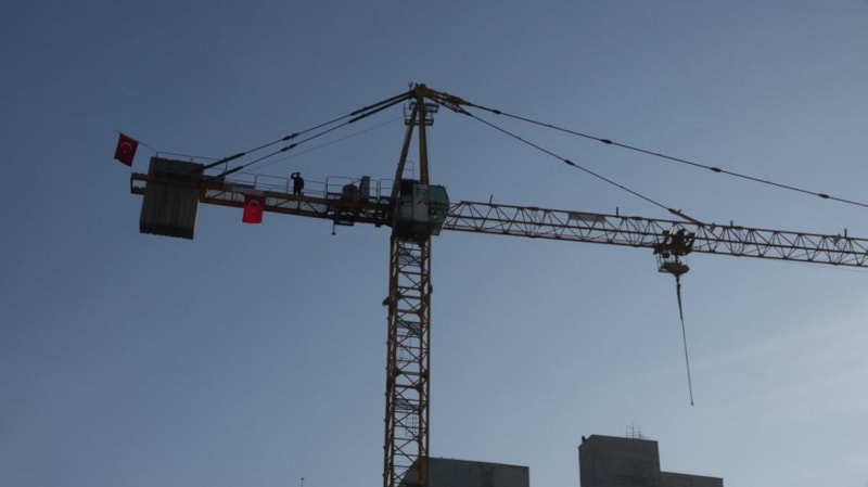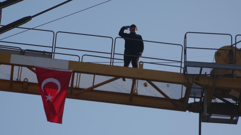 Çorum'da saat 09.05'te çalan sireni duyan 80 metre yüksekte çalışan kule vinç operatörü, işini bırakıp saygı duruşuna geçti.