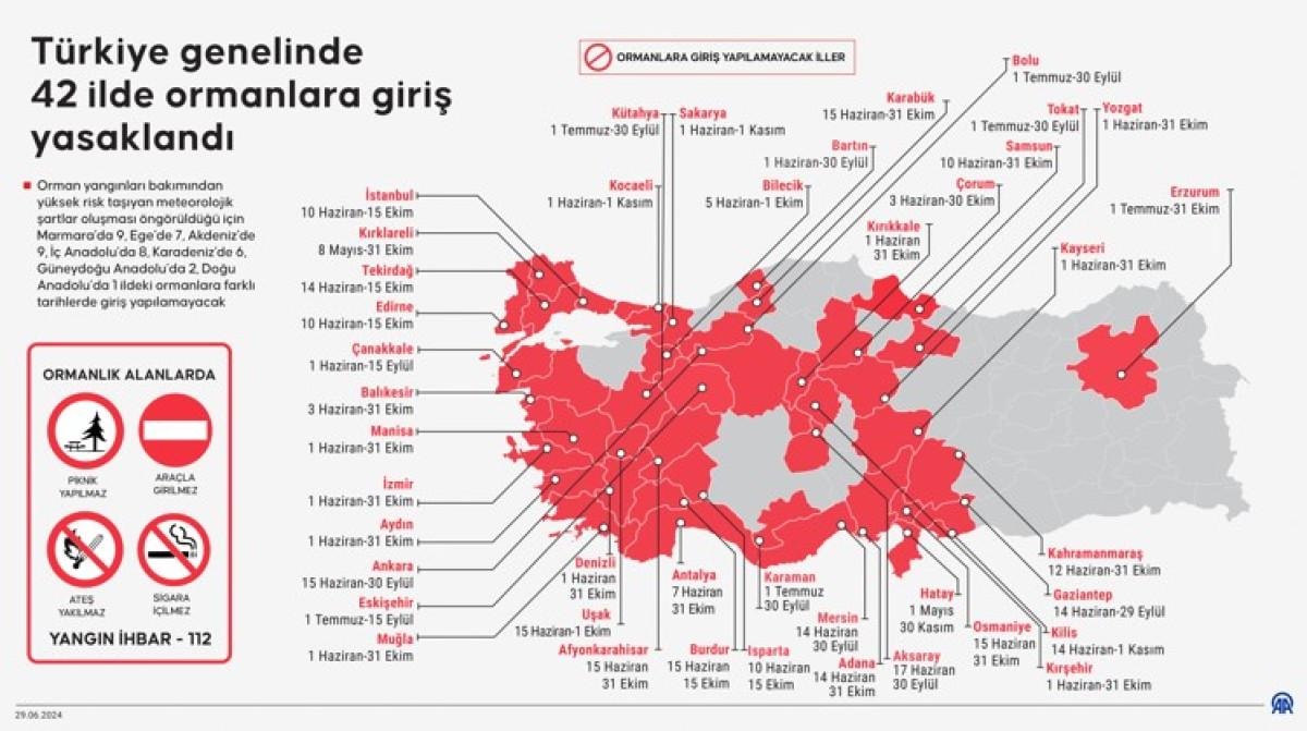 Orman yangınları bakımından yüksek risk taşıyan meteorolojik şartlar oluşması öngörüldüğü için Marmara'da 9, Ege'de 7, Akdeniz'de 9, İç Anadolu'da 8, Karadeniz'de 6, Güneydoğu Anadolu’da 2, Doğu Anadolu’da 1 ildeki ormanlara farklı tarihlerde giriş yapılamayacak.