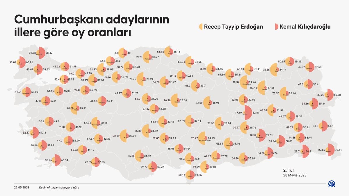 Erdoğan tüm illerde oy oranını artırırken Kemal Kılıçdaroğlu'nun oy oranı ise Şanlıurfa, Diyarbakır, Adıyaman, Siirt, Mardin, Ağrı, Bitlis, Hakkari, Bingöl, Muş ve Van'da düştü.